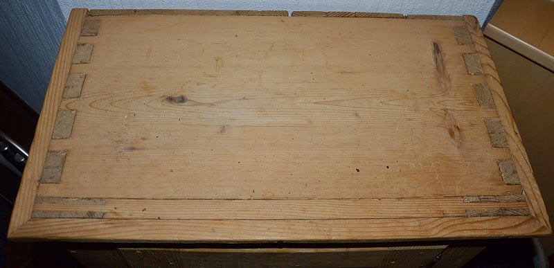 Der Schrank kam mit einem quietschbunten Knauf zu uns, ich habe ihm erstmal wieder ein original altes Einsteckschloss und eine passende Schlüsselblende besorgt.