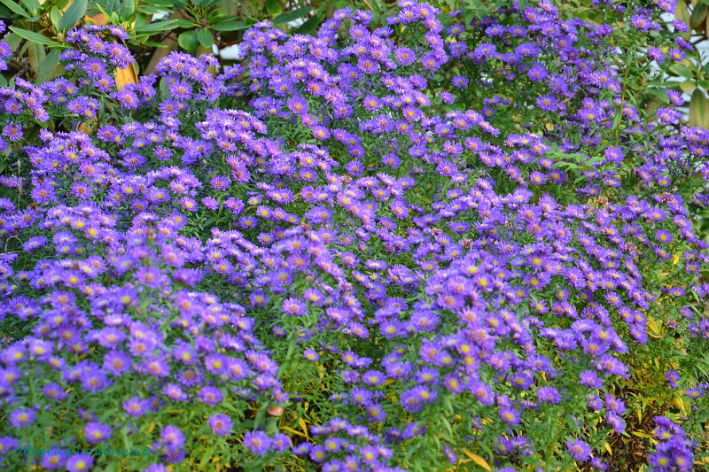 Cornuas Kousa in Herbstpracht neben knalligen Astern.