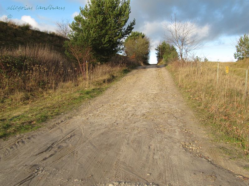 Unten angekommen wundert man sich vielleicht, warum der Wald gegenüber auf einem eckigen Hügel steht. Wir sind in einem Geestgebiet und hier an dieser Stelle wird und wurde seit vielen Jahren Sand abgebaut. Auf den Abbau folgt dann wieder Bewirtschaftung oder Aufforstung, nur der Hügel mit Wald und Anwesen blieb wohl verschont.