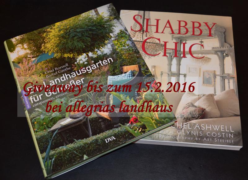 Beide Bücher stammen aus meinem eigenen gut bestückten Bücherregal und sind keine Verlagsgabe, sondern selbst bezahlt. ;-)Was Ihr tun müsst, um eines der Bücher zu gewinnen, ist, einen kleinen Kommi hier zu hinterlassen und dabei ein G für das Gartenbuch oder ein S für das Shabby-Buch zu vermerken. Die Lose werden getrennt gezogen, damit die Interessenlage gewahrt wird. Bis zum 15.2. kann man sich hier verewigen, dann wird gelost. Die Gewinner veröffentliche ich in einem Extra-Post, also bitte unbedingt wieder vorbeischauen!