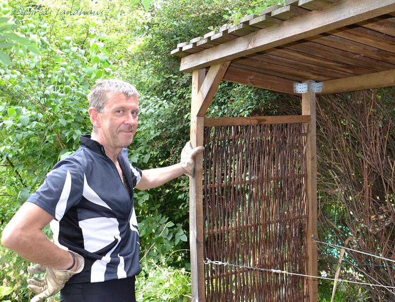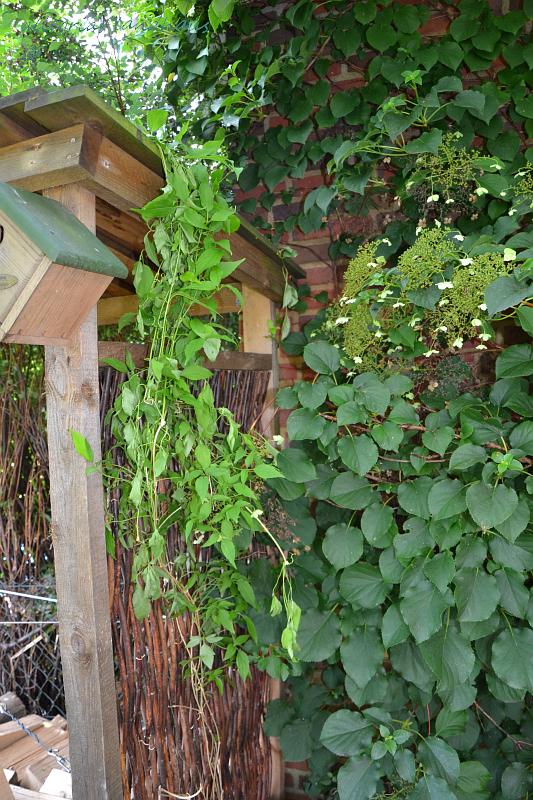 In vorauseilendem Gehorsam hatte ich die Clematis rechts und links aus der Flechtmatte gepult und an die Seite gelegt, damit sie keine Schaden nehmen während unserer Reparaturarbeiten. Ich dachte, wir müssen den Unterstand vorziehen, dann wären die Clematis aus dem Boden gerissen worden. Hätte ich mal gewartet, mein Mann hat das an Ort und Stelle erledigt. Leider musste ich für das „Abpflücken“ einige Ranken durchtrennen, weil sie durch das Geflecht hindurch gewachsen waren. Nun habe ich die verbliebenen Reste wieder aufgebunden und hoffe, sie hangeln sich wieder hinauf und hindurch. Jetzt hängen sie da wie ein Schluck Wasser in der Kurve.