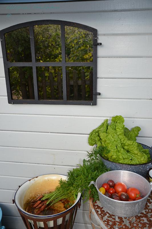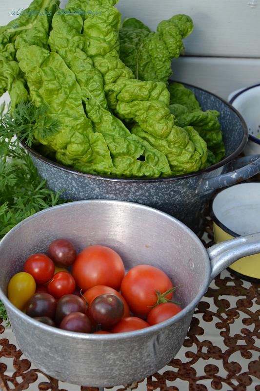 Die Tomatenernte im Alustieltopf und der Mangold im Hintergrund werden nicht vorgewaschen, nur die erdigen Möhren und Ähnliches baden in Regenwasser, bevor sie das Haus betreten dürfen 😉