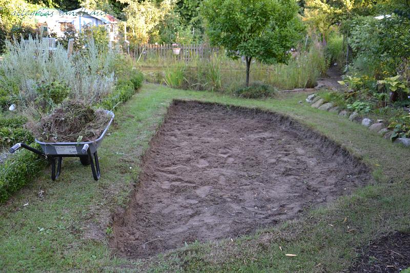 Immerhin habe ich im letzten Jahr die Grube ausgehoben, bis mir Zeit und Lust fehlten. Der Mantel des Schweigens schwebte über dem zukünftigen Senkgarten, der Winter kam und nun haben wir schon wieder Spätsommer. So manches Mal bin ich beim drum herum wandern fast abgerutscht und reingefallen. Oder der Rasenmäher drohte abzustürzen. Nun aber mal los, Frau Allegria, mach endlich fertig, sonst kannst Du Deinen Garten nie richtig präsentieren!