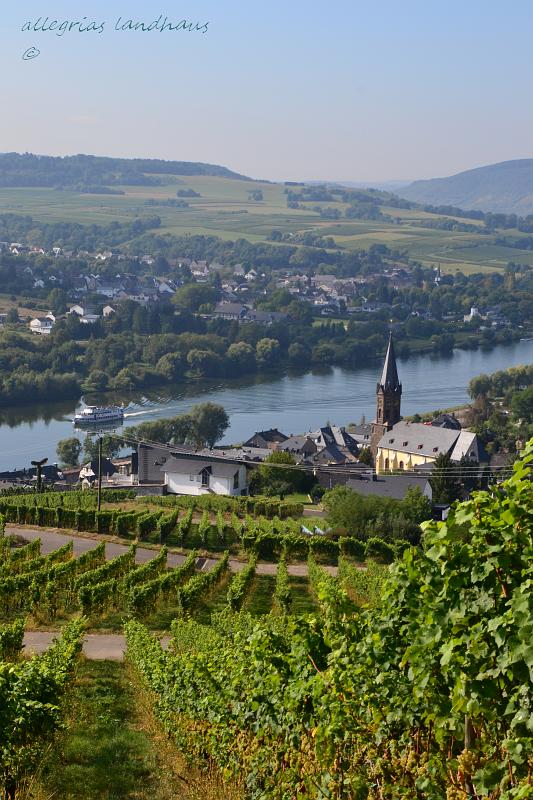 Wandertag Nummer 2 führte uns auf die andere Moselseite nach Mülheim auf den Panoramaweg. Dazu kamen dann noch gute 6km Hin- und Rückweg von und zum Ferienhaus. An einigen Stellen hatten wir einen tollen Blick hinüber nach Lieser und aufs dortige Schloß.