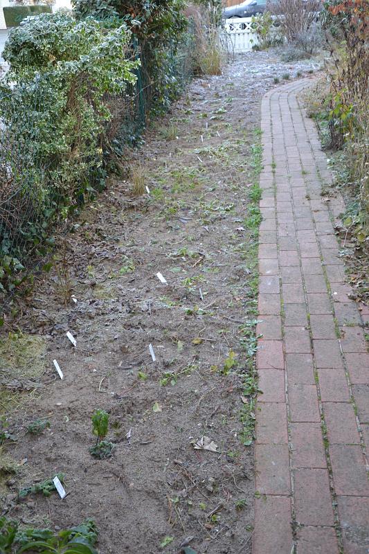 Ich hatte extra noch einen Urlaubstag dran gehängt, um die Sache mit den Blumenzwiebeln zu erledigen. Unten rechts das erstarrte neu besiedelte Westzaunbeet.