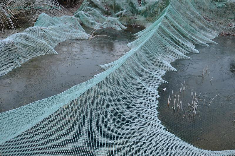Das Laubschutznetz ist samt Spanndraht abgesunken und im Teich eingefroren.