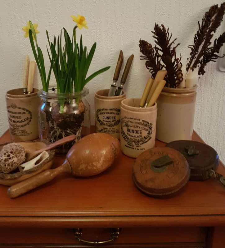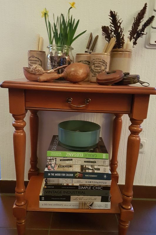 Eigentlich wollte ich die inzwischen blühenden Apfelbaumzweige, die noch immer im Krug auf dem Kaminofen stehen und vor 2 Wochen hier zusammen mit Mimosen im Bild waren, mit etwas anderem Frühlingshaften kombinieren.