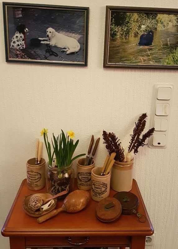 Darüber hängen Fotos der Hunde, die hier vor vielen Jahren lebten. Links Janne, die Golden-Retriever-Hündin meines verstorbenen Lebensgefährten und rechts mein Neufundländer Don in irgendeinem Flüsschen in Frankreich, unvergessen! ?